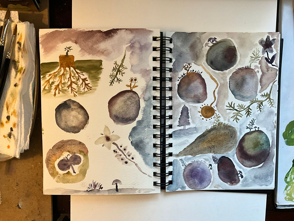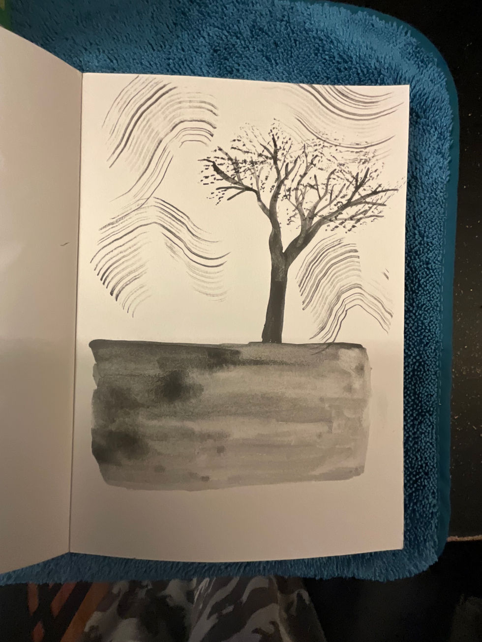 A compilation of abstract art pieces, including ink tree drawing, abstract landscapes, and minimalist watercolor compositions.