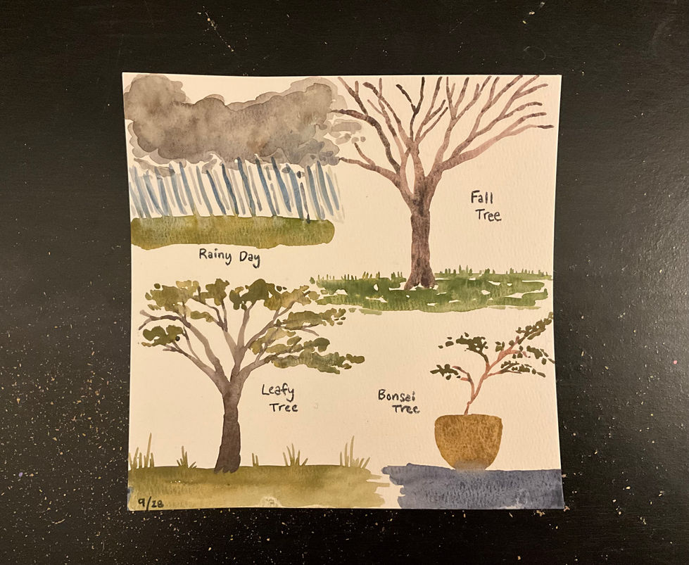 A series of artworks capturing the textures and patterns found in nature, including paintbrush textures, watercolor trees, and nature-themed sketchbook paintings.